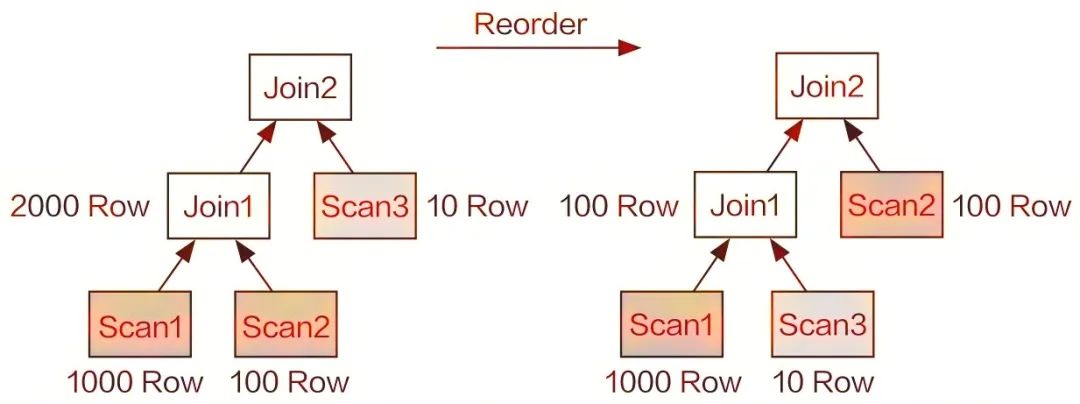 Join Reorder可以通过一些表的统计信息,自动调整Join顺序。而Join顺序的调整可有效减小Join操作中生成的中间数据集的大小,从而加速查询的执行,如图1-16所示。