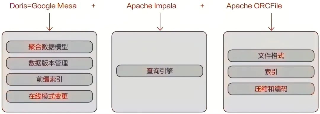 从设计上来说,Doris融合了Google Mesa的数据存储模型、Apache的ORCFile存储格式、Apache Impala的查询引擎和MySQL交互协议,是一个拥有先进技术和先进架构的领先设计产品,如图1-4所示。