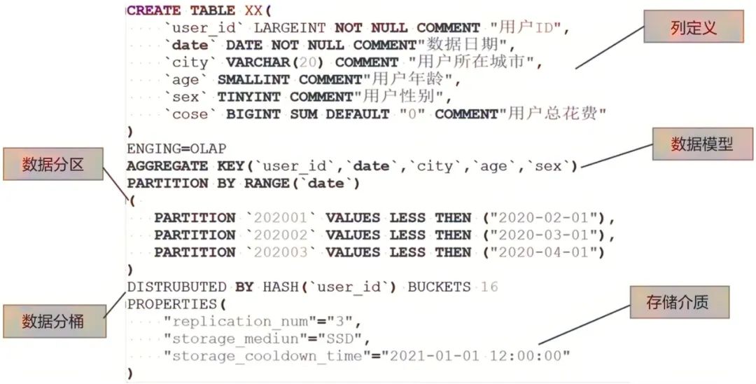 在数据建模方面,Doris支持Aggregate、Unique和Duplicate三种模型,可以满足OLAP领域的各种应用场景。同时,相对于MySQL,Doris只增加了一些分布式系统所具有的特性,比如分布键、分桶等。Doris建表语句如图1-5所示。
