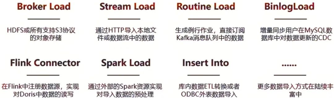 在数据导入方面,Doris提供多种数据导入方案(如图1-6所示),同时在数据导入过程中保证原子性。不论使用Broker Load进行批量导入,还是使用INSERT语句进行单条导入,都是一个完整的事务操作。导入事务可以保证一个批次内的数据原子性生效,不会出现部分数据写入的情况。