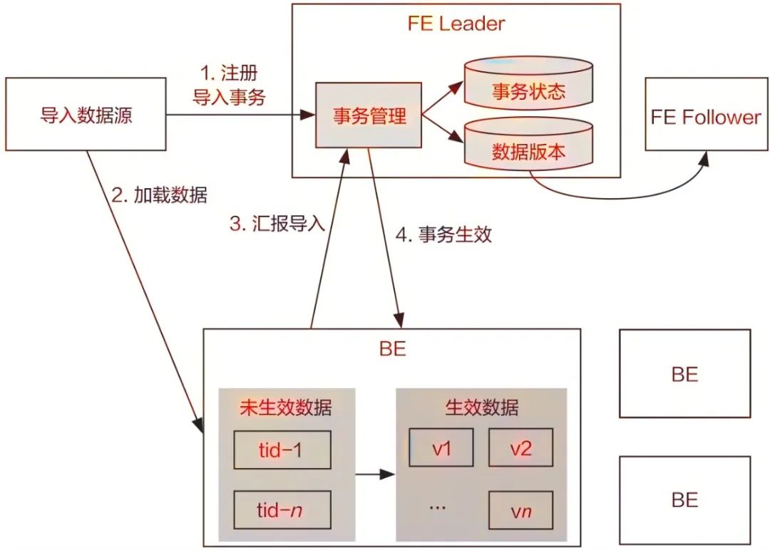 同时,每一个导入作业都会生成一个Label,这个Label在数据库内用于唯一区分导入作业。Label用于保证对应的导入作业仅能成功导入一次。一个成功导入的Label再次调用时,会被拒绝并报错:Label already used。通过这个机制,数据消费侧可以实现At-Most-Once语义。如果结合上游系统的At-Least-Once语义,我们可以实现端到端数据导入的Exactly-Once语义。数据导入流程如图1-7所示。