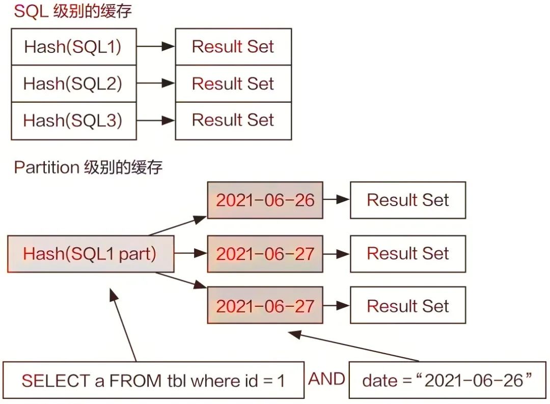 其次是合理的缓存功能。Doris支持SQL级别和Partition级别的查询缓存,如图1-9所示。其中,SQL级别的缓存以SQL语句的Hash值为Key,直接缓存SQL查询结果,非常适合更新频率不高,但是查询非常频繁的场景。而Partition级别的缓存会智能地将SQL查询结果中不同分区的数据进行存储,之后的查询中可以利用已缓存分区的数据及新分区实时查询数据得到最终结果,从而降低重复数据查询,减少对系统资源的消耗。