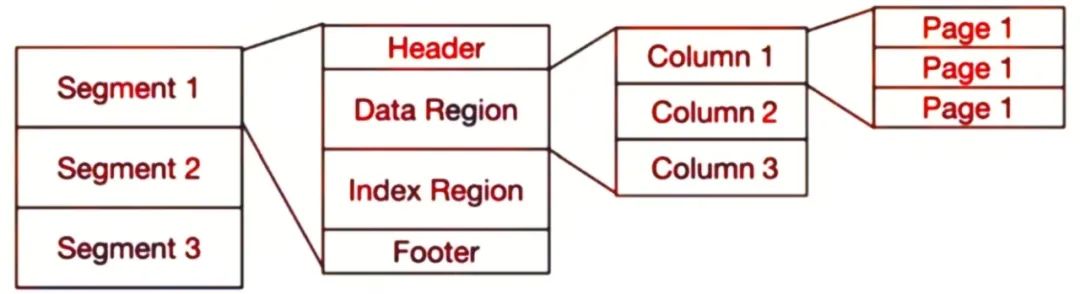 从文件格式看,Doris支持的文件格式和Parquet比较类似。一个数据版本会被分割成最大空间为256MB的Segment,每个Segment对应一个物理文件。Segment通常分为Header、Data Region、Index Region、Footer几个部分。Data Region用于按列存储数据,每一列又被分为多个Page,而Page是Doris的最小数据存储单元,如图1-10所示。