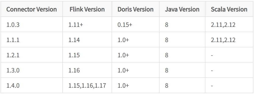 <!-- flink-doris-connector --><dependency><groupId>org.apache.doris</groupId><artifactId>flink-doris-connector-1.16</artifactId><version>1.4.0</version></dependency>