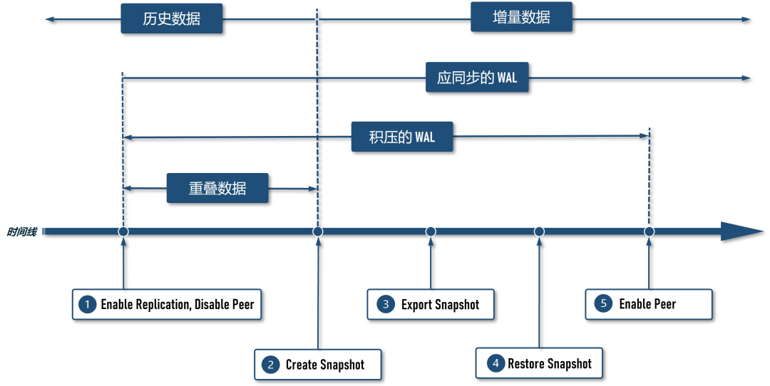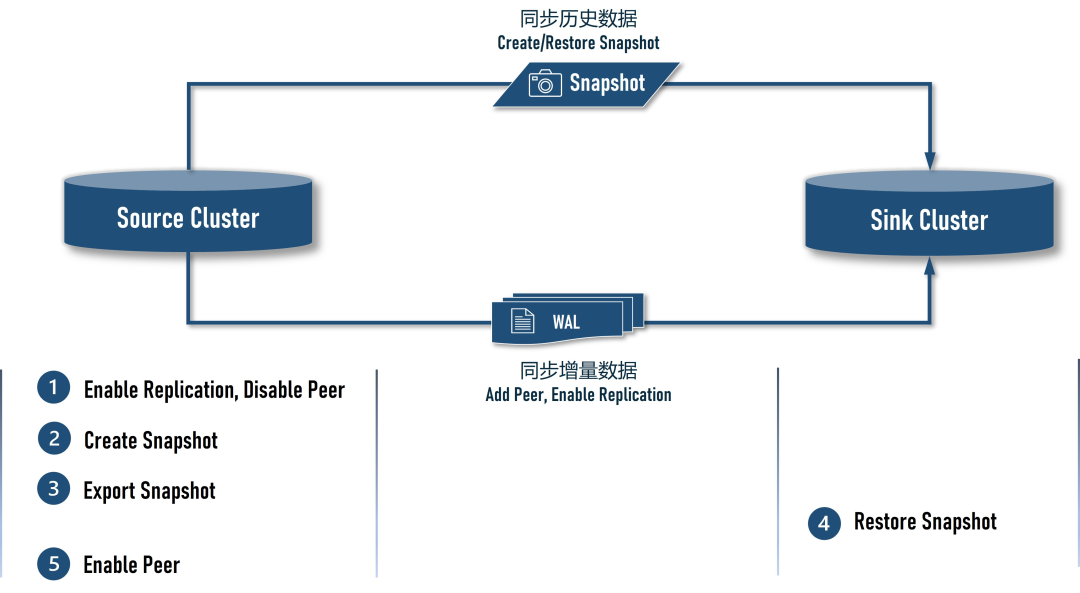 在 Source Cluster 上将 Sink Cluster 添加为 peer,但需先 disable peer,然后再 enable 目标表的 replication,目的是让 Source Cluster 在创建前快照前先积累 WAL 日志,避免迁移过程中丢失数据 在 Source Cluster 上创建快照 在 Source Cluster 上将创建好的快照导出到 S3 在 Sink Cluster 上还原快照 在 Source Cluster 上 enable peer,恢复数据同步,直至数据追平