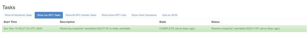 确认快照已存在 sudo -u hbase hbase snapshot info -list-snapshots 还原快照 cat << EOF | nohup sudo -u hbase hbase shell &> restore-snapshot.out &