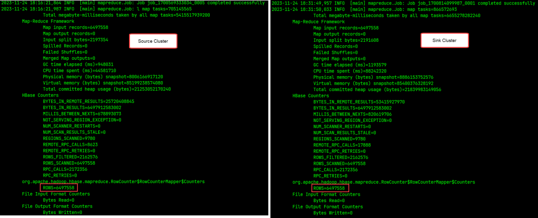/var/log/hbase/hbase.log可以在文件末尾看到 RowCounter 输出的统计结果,如果 ROWS 数据一致,就表明数据一致,迁移过程中没有丢失数据:
