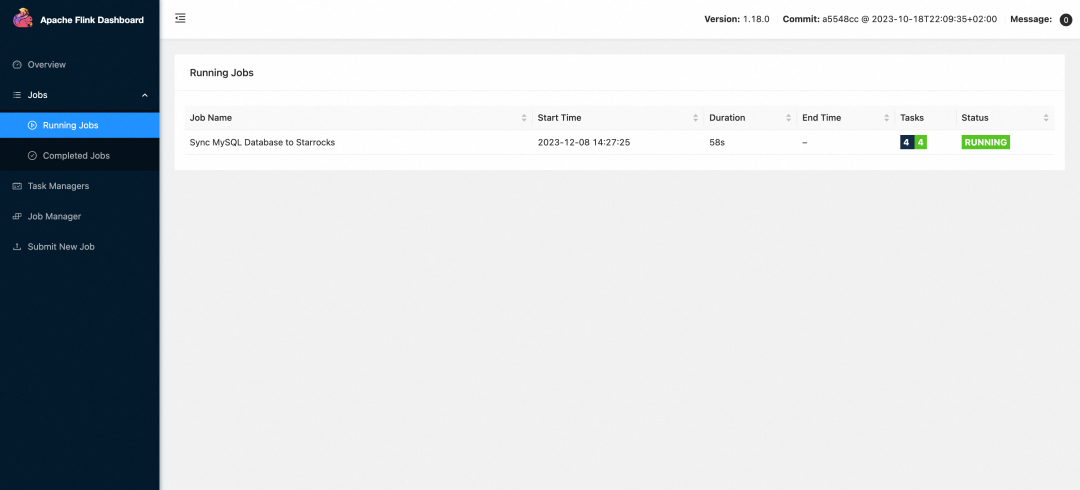 在 Flink Web UI,可以看到一个名为 Sync MySQL Database to Doris