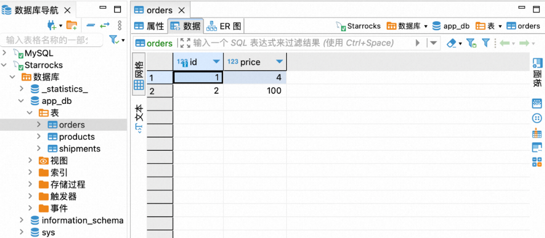 表中插入一条数据INSERT INTO app_db.orders (id, price) VALUES (3, 100.00);在 MySQL 的