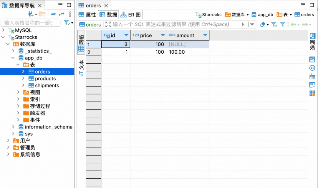 接下来,修改 MySQL 数据库中表的数据,StarRocks 中显示的订单数据也将实时更新: