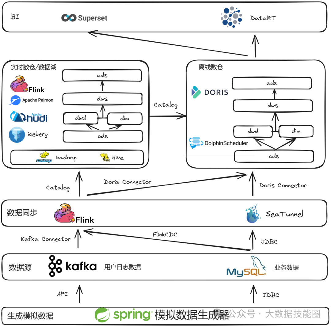 这或许是一个对你有用的开源项目,data-warehouse-learning 项目是一套基于 MySQL + Kafka + Hadoop + Hive + Dolphinscheduler + Doris + Seatunnel + Paimon + Hudi + Iceberg + Flink + Dinky + DataRT + SuperSet 实现的实时离线数仓(数据湖)系统,以大家最熟悉的电商业务为切入点,详细讲述并实现了数据产生、同步、数据建模、数仓(数据湖)建设、数据服务、BI报表展示等数据全链路处理流程。