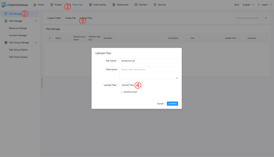 在使用 Spark 任务节点时,需要利用资源中心上传执行程序的 jar 包,可参考资源中心。