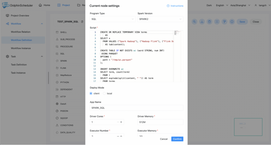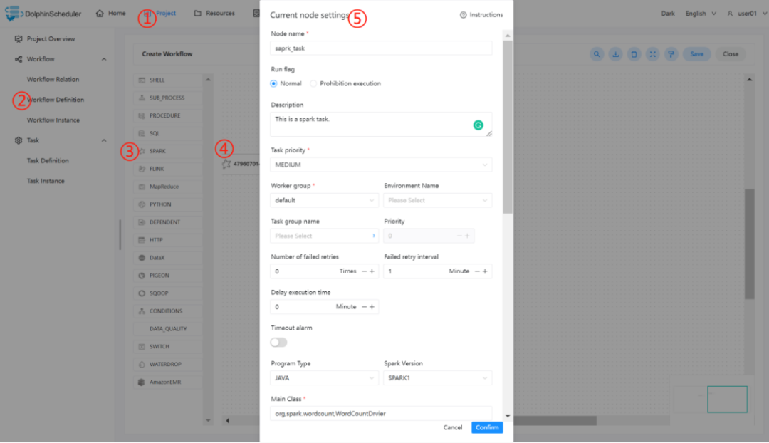 注意:JAVA 和 Scala 只用于标识,使用 Spark 任务时没有区别。如果应用程序是由 Python 开发的,那么可以忽略表单中的参数Main Class。参数SQL脚本仅适用于 SQL 类型,在 JAVA、Scala 和 Python 中可以忽略。