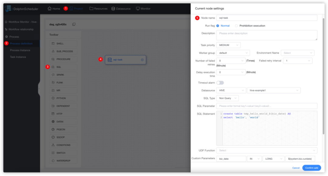 该样例向hive中创建临时表tmp_hello_world并写入一行数据。选择SQL类型为非查询,在创建临时表之前需要确保该表不存在,所以我们使用自定义参数,在每次运行时获取当天时间作为表名后缀,这样这个任务就可以每天运行。创建的表名格式为:tmp_hello_world_{yyyyMMdd}。