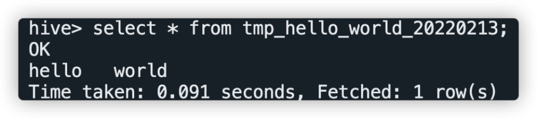 登录集群使用hive命令或使用beeline、JDBC等方式连接apache hive进行查询,查询SQL为select * from tmp_hello_world_{yyyyMMdd},请将{yyyyMMdd}替换为运行当天的日期,查询截图如下: