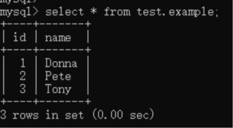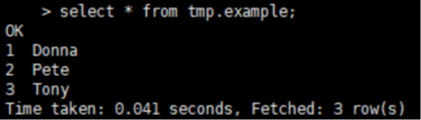 该样例演示为从 MySQL 数据导入到 Hive 中。其中 MySQL 数据库名称为:test,表名称为example。下图为样例数据。