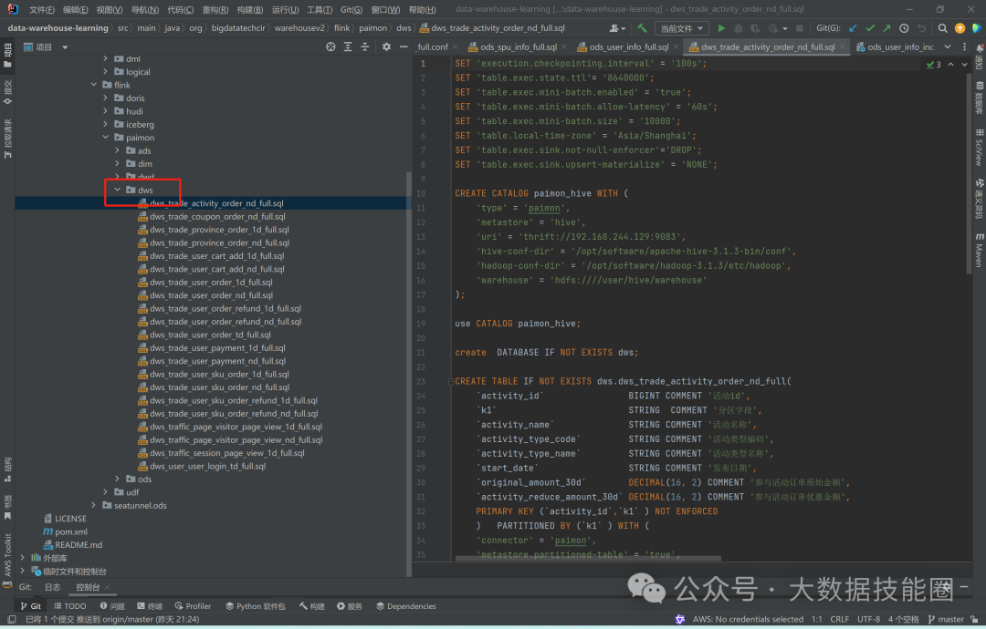 # 代码查看路径org/bigdatatechcir/warehousev2/flink/paimon/dws# 代码样例SET 'execution.checkpointing.interval' = '100s';SET 'table.exec.state.ttl'= '8640000';SET 'table.exec.mini-batch.enabled' = 'true';SET 'table.exec.mini-batch.allow-latency' = '60s';SET 'table.exec.mini-batch.size' = '10000';SET 'table.local-time-zone' = 'Asia/Shanghai';SET 'table.exec.sink.not-null-enforcer'='DROP';SET 'table.exec.sink.upsert-materialize' = 'NONE';CREATE CATALOG paimon_hive WITH ('type' = 'paimon','metastore' = 'hive','uri' = 'thrift://192.168.244.129:9083','hive-conf-dir' = '/opt/software/apache-hive-3.1.3-bin/conf','hadoop-conf-dir' = '/opt/software/hadoop-3.1.3/etc/hadoop','warehouse' = 'hdfs:////user/hive/warehouse');use CATALOG paimon_hive;create DATABASE IF NOT EXISTS dws;CREATE TABLE IF NOT EXISTS dws.dws_trade_activity_order_nd_full(`activity_id` BIGINT COMMENT '活动id',`k1` STRING COMMENT '分区字段',`activity_name` STRING COMMENT '活动名称',`activity_type_code` STRING COMMENT '活动类型编码',`activity_type_name` STRING COMMENT '活动类型名称',`start_date` STRING COMMENT '发布日期',`original_amount_30d` DECIMAL(16, 2) COMMENT '参与活动订单原始金额',`activity_reduce_amount_30d` DECIMAL(16, 2) COMMENT '参与活动订单优惠金额',PRIMARY KEY (`activity_id`,`k1` ) NOT ENFORCED) PARTITIONED BY (`k1` ) WITH ('connector' = 'paimon','metastore.partitioned-table' = 'true','file.format' = 'parquet','write-buffer-size' = '512mb','write-buffer-spillable' = 'true' ,'partition.expiration-time' = '1 d','partition.expiration-check-interval' = '1 h','partition.timestamp-formatter' = 'yyyy-MM-dd','partition.timestamp-pattern' = '$k1');INSERT INTO dws.dws_trade_activity_order_nd_full(activity_id, k1, activity_name, activity_type_code, activity_type_name, start_date, original_amount_30d, activity_reduce_amount_30d)selectact.activity_id,od.k1,activity_name,activity_type_code,activity_type_name,date_format(start_time,'yyyy-MM-dd'),sum(split_original_amount),sum(split_activity_amount)from(selectactivity_id,activity_name,activity_type_code,activity_type_name,start_timefrom dim.dim_activity_fullgroup by activity_id, activity_name, activity_type_code, activity_type_name,start_time)actleft join(selectactivity_id,k1,order_id,split_original_amount,split_activity_amountfrom dwd.dwd_trade_order_detail_fullwhere activity_id is not null)odon act.activity_id=od.activity_idgroup by act.activity_id,od.k1,activity_name,activity_type_code,activity_type_name,start_time;