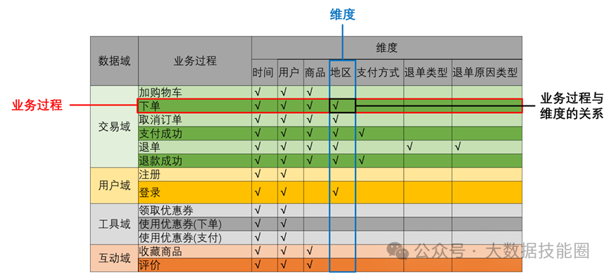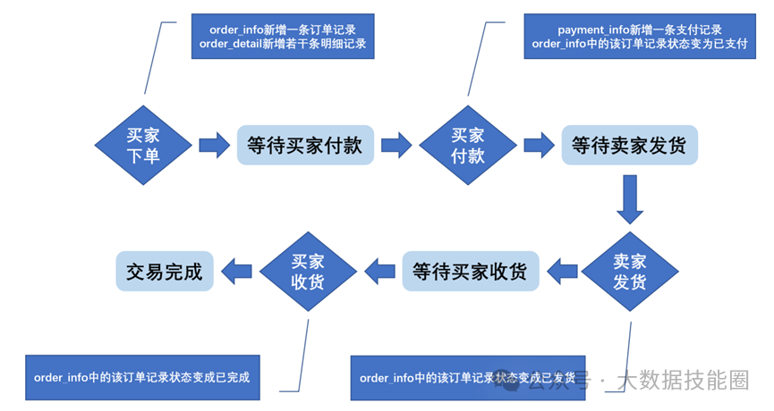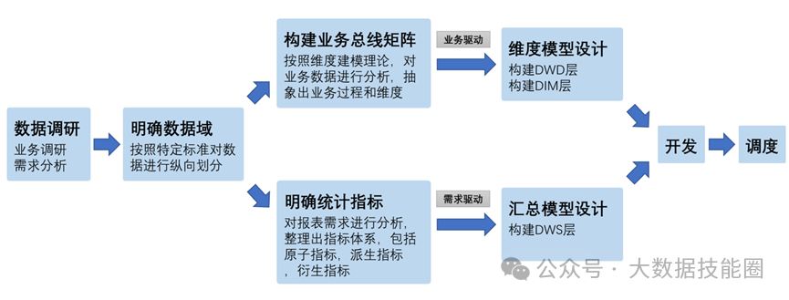 想要使数据仓库中的数据真正发挥最大的作用,必须对其进行分层,数据仓库分层的优点如下。• 将复杂问题简单化。可以将一个复杂的任务分解成多个步骤来完成,每一层只处理单一的任务。• 减少重复开发。规范数据分层,通过使用中间层数据,可以大大减少重复计算量,增加计算结果的复用性。• 清晰数据结构。每个数据分层都有它的作用域,这样我们在使用表的时候更方便定位和理解。• 数据血缘追踪。我们最终向业务人员展示的是一张能直观看到结果的数据表,但是这张表的数据来源可能有很多,如果结果表出现问题,则可以快速定位到问题位置,并清楚危害范围。数据调研的工作分为两项,分别是业务调研和需求分析。这两项工作做的是否充分,直接影响数据仓库的质量。下面以电商的交易业务为例进行演示,交易业务涉及的业务过程有买家下单、买家支付、卖家发货、买家收货,具体流程如图所示。在分析以上需求时,需要明确需求所包括的业务过程及维度,例如,该需求所包括的业务过程是买家下单,所包括的维度有日期、省份、商品分类。数据仓库模型设计除了进行横向分层,通常还需要根据业务情况纵向划分数据域。划分数据域的意义是便于数据的管理和应用。通常可以根据业务过程或者部门进行划分,本数据仓库项目根据业务过程进行划分,需要注意的是,一个业务过程只能属于一个数据