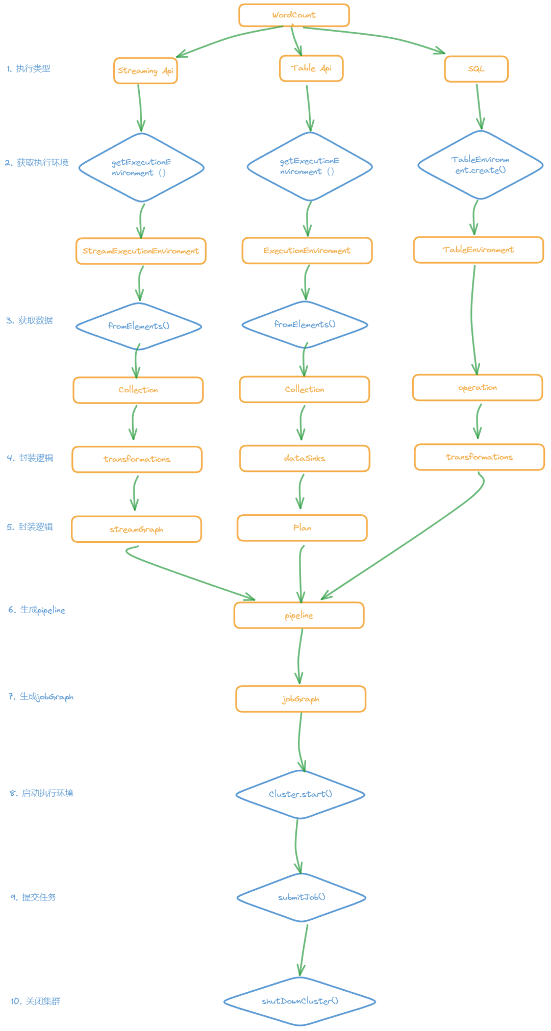 今天我们来总结一下在不同Api模式下的WordCount执行步骤有哪些。下图展示了WordCount代码分别在Streaming API、Table API 及 SQL模式下的执行流程。整体可以分为十步,其中SQL本身不存在独立读取数据这一步,可以理解为九步。