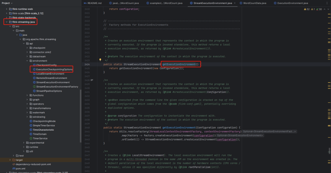 ctrl + 鼠标点击 getExecutionEnvironment()方法,将进入位于flink-streaming-java下面的org.apache.flink.streaming.api.environment包下面的StreamExecutionEnvironment类中