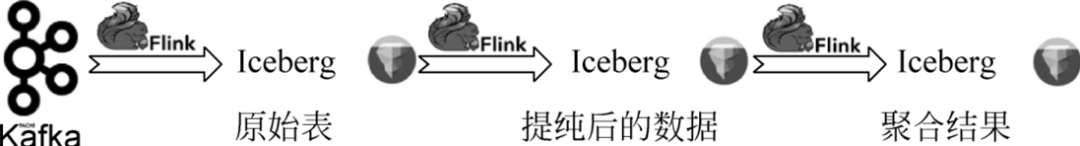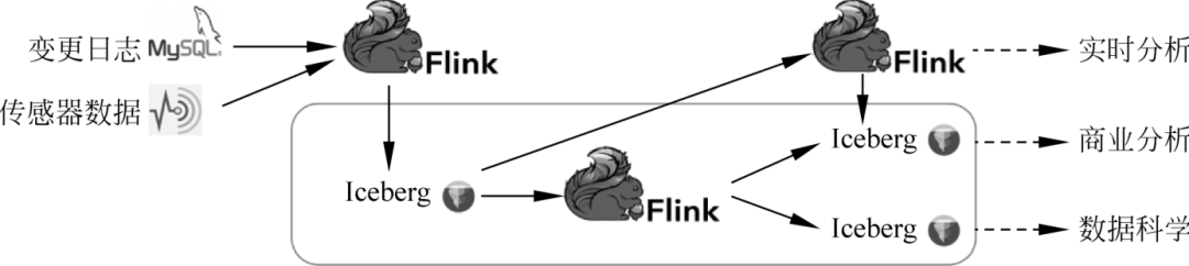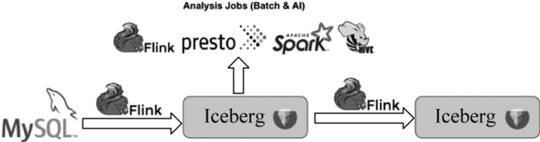 在实际应用中,有很多场景的实时性要求不是很苛刻,例如,可以放宽到分钟级的水平。这种场景称为近实时场景。可以使用Flink+Iceberg来优化整个架构,如图所示。