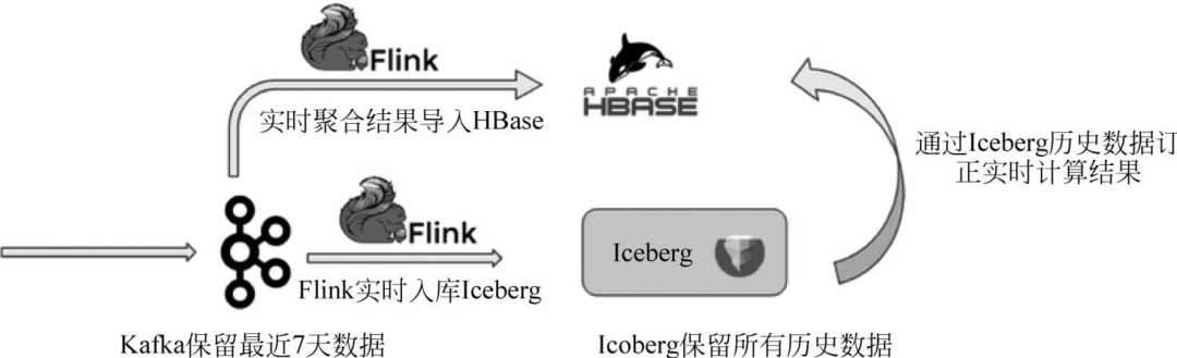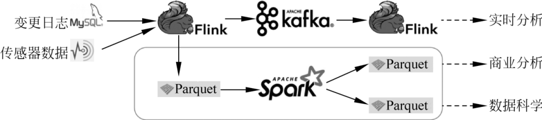 在常用的Lambda架构中,有实时处理模块和离线处理模块。实时模块一般由Flink、Kafka和HBase构建,离线模块一般由Parquet和Spark等组件构建,如图所示。