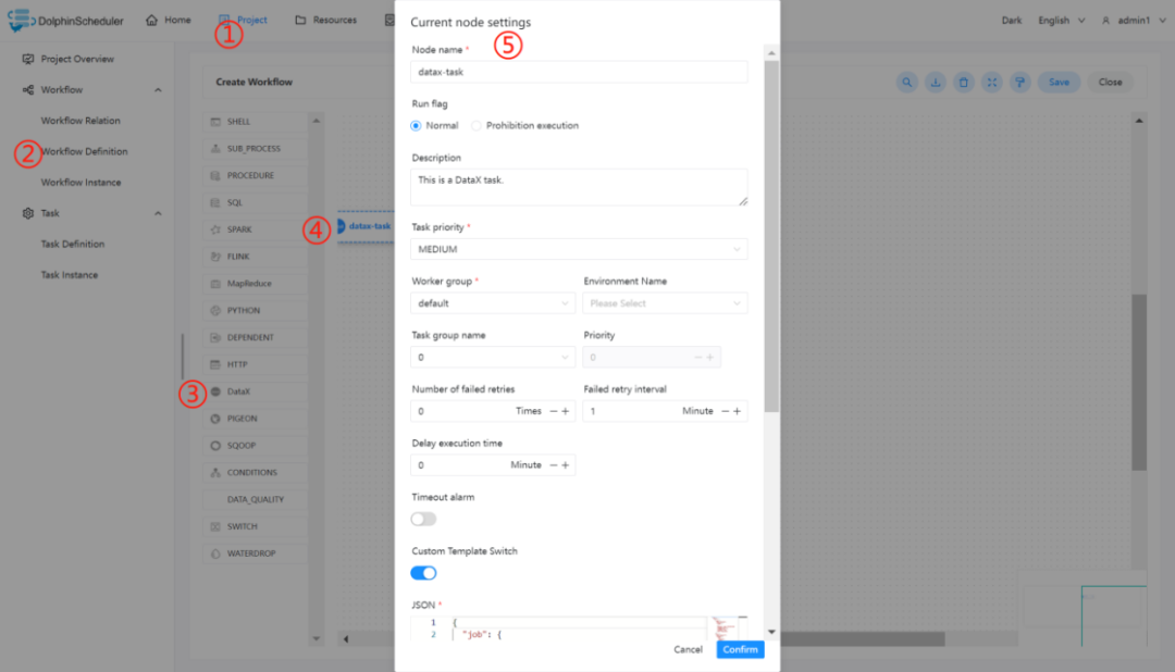若默认提供的数据源不满足需求,可在自定义模板选项中,根据实际使用环境来配置 DataX 的 writer 和 reader