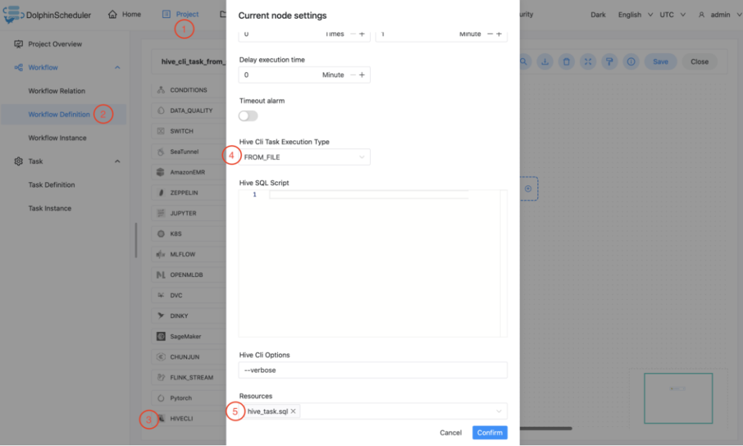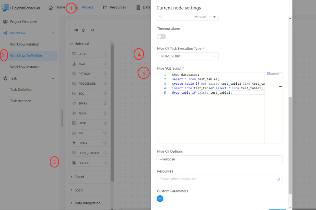资源 | 如果您选择FROM_FILE作为Hive Cli任务类型,您需要在资源中选择Hive SQL文件。 |