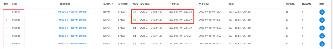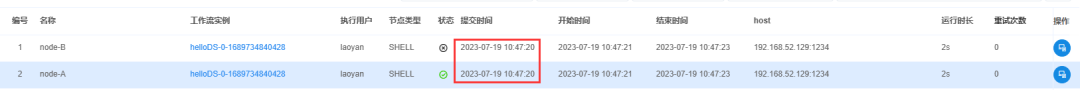 将工作流上线,执行,查看A的日志,发现打印了。