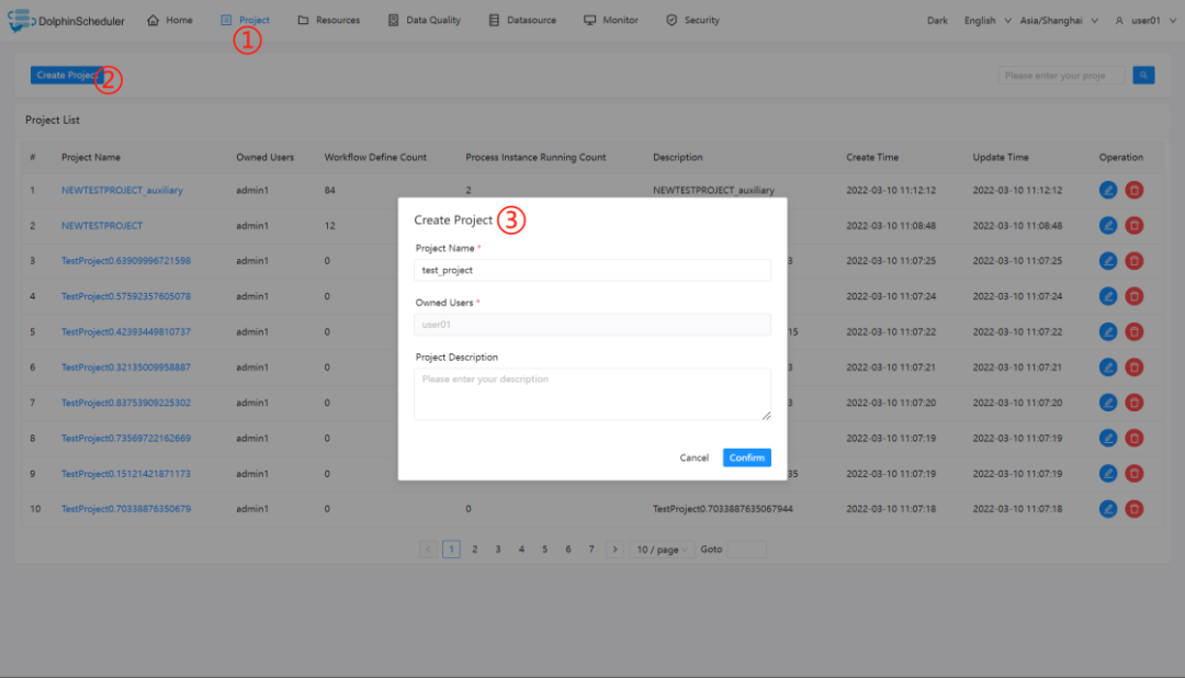 点击"项目管理"进入项目管理页面,点击“创建项目”按钮,输入项目名称,项目描述,点击“提交”,创建新的项目。