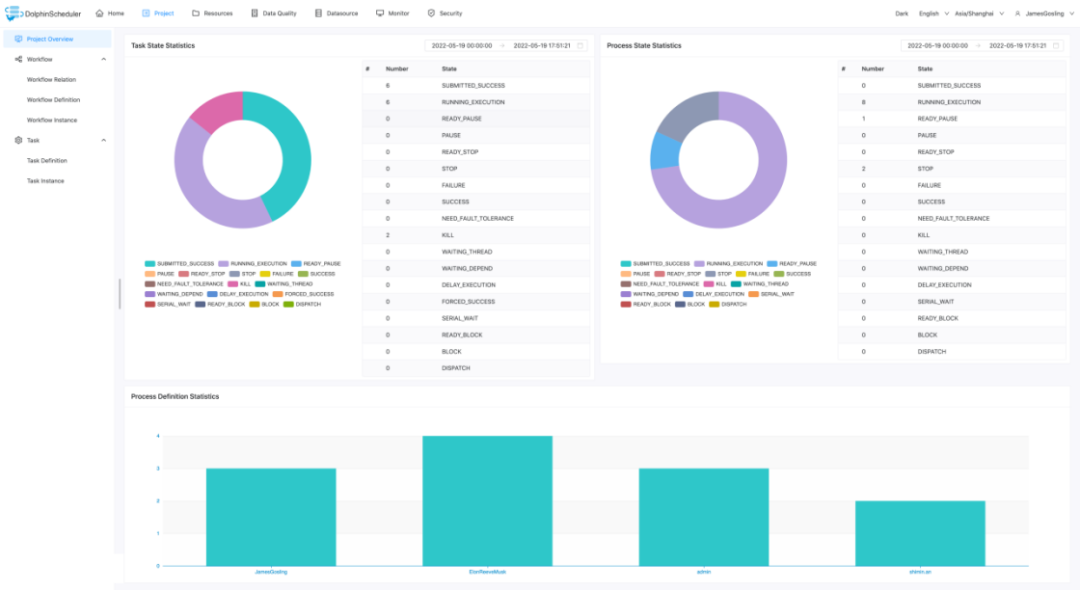 •流程状态统计:在指定时间范围内,统计工作流实例中状态为提交成功、正在运行、准备暂停、暂停、准备停止、停止、失败、成功、需要容错、kill、等待线程的个数