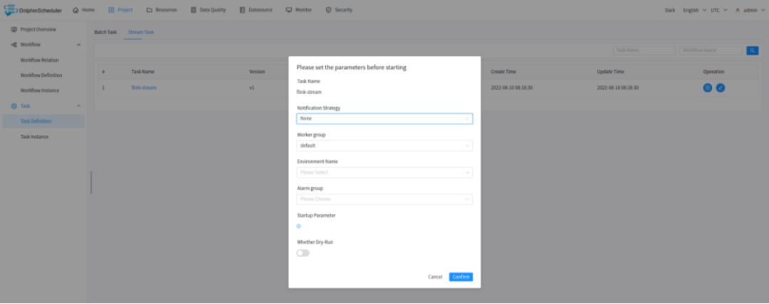 点击实时任务执行,检查执行参数后点击确认,即可提交实时任务。