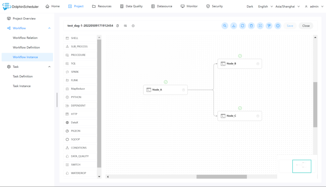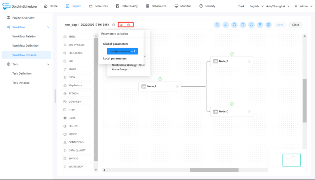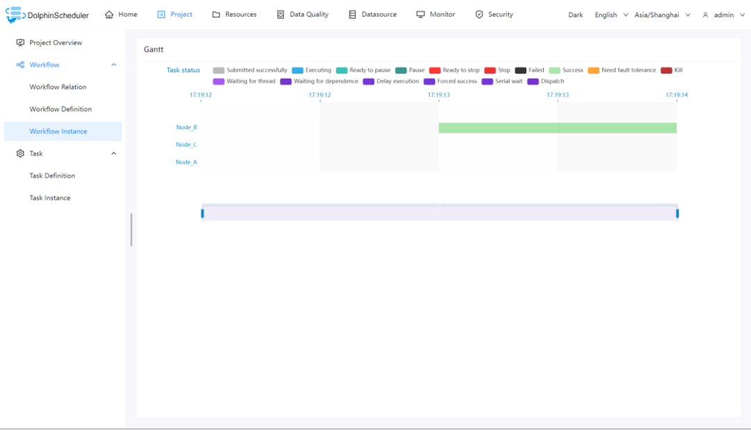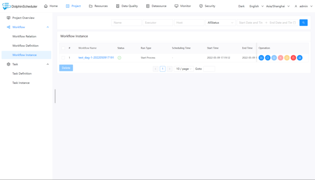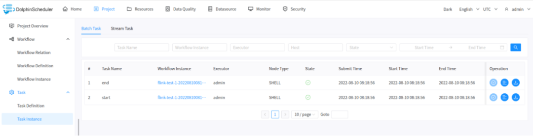 •点击项目管理->工作流->任务实例,进入任务实例页面,如下图所示,点击工作流实例名称,可跳转到工作流实例DAG图查看任务状态。