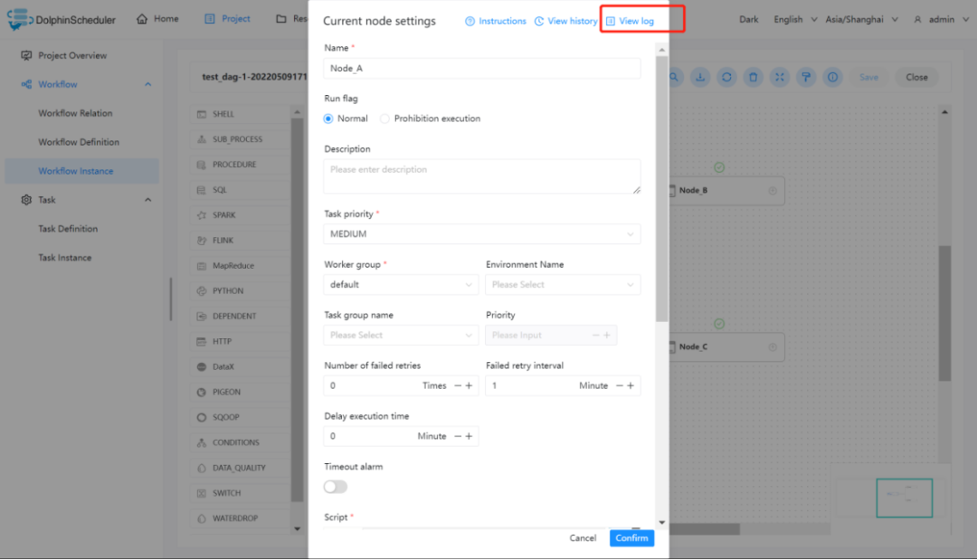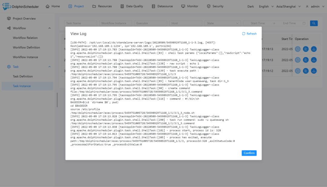 •点击"查看日志",弹出日志弹框,如下图所示,任务实例页面也可查看任务日志。