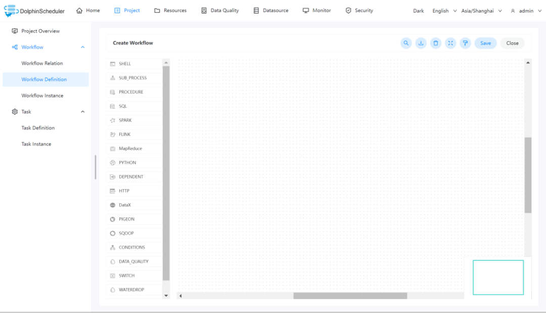 •点击项目管理->工作流->工作流定义,进入工作流定义页面,点击“创建工作流”按钮,进入工作流DAG编辑页面,如下图所示: