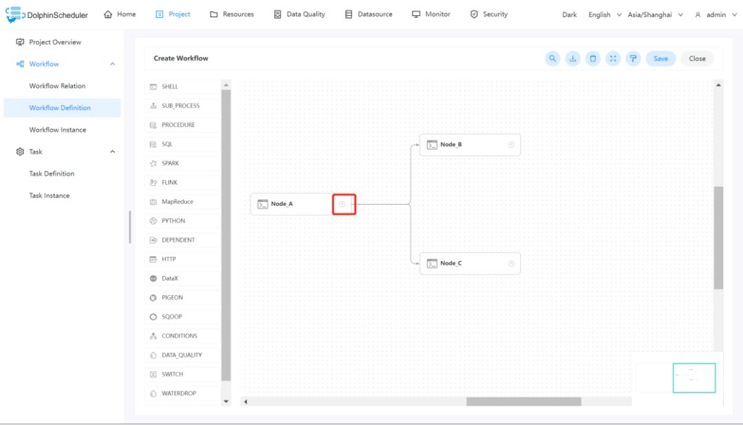 •配置任务之间的依赖关系: 点击任务节点的右侧加号连接任务;如下图所示,任务 Node_B 和任务 Node_C 并行执行,当任务 Node_A 执行完,任务 Node_B、Node_C 会同时执行。