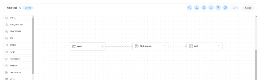 •实时任务的依赖关系: 若DAG中包含了实时任务的组件,则实时任务的关联关系显示为虚线,在执行工作流实例的时候会跳过实时任务的执行