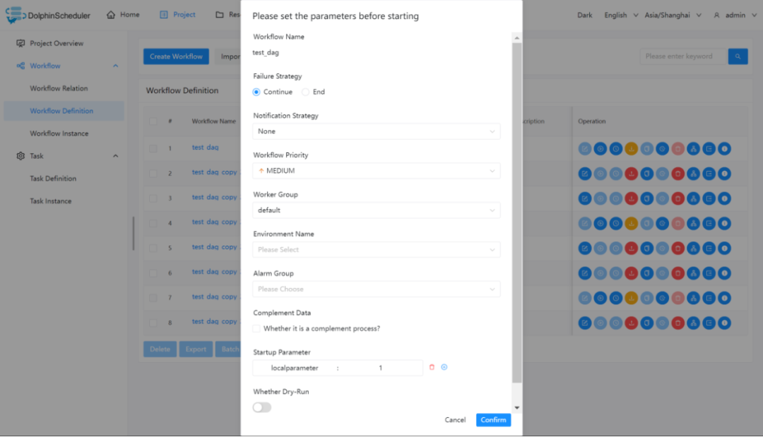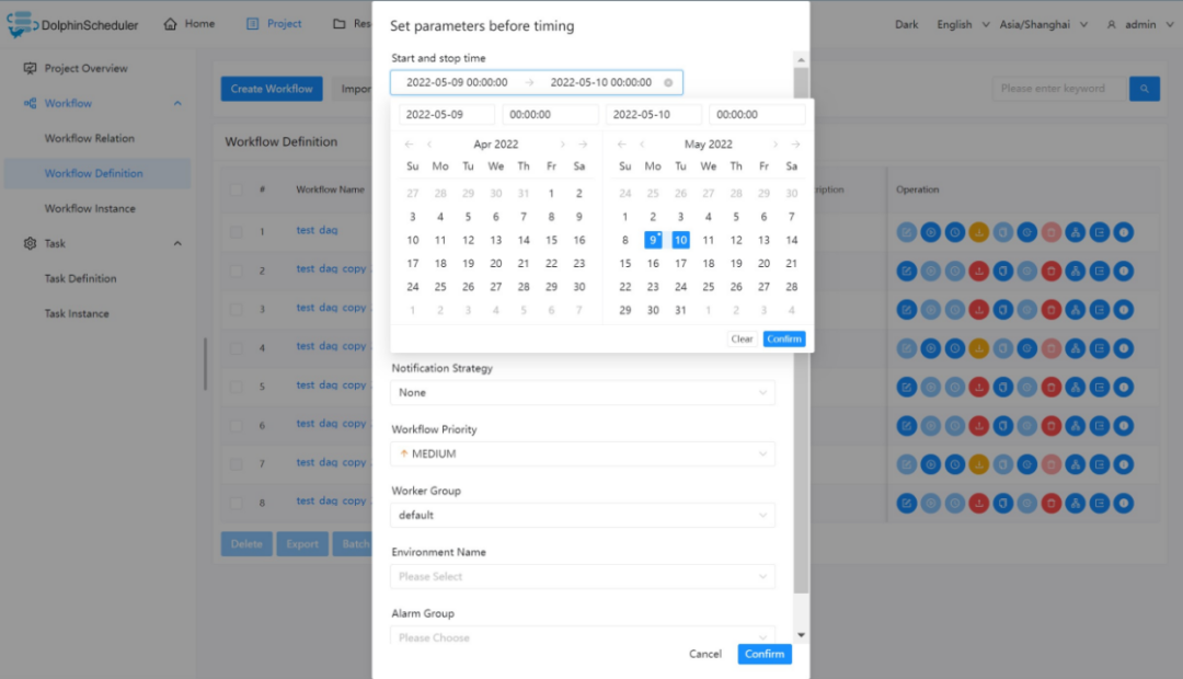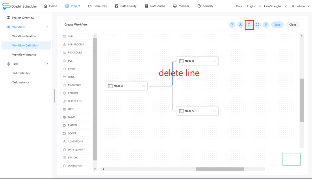 •删除: 删除工作流定义。在同一个项目中,只能删除自己创建的工作流定义,其他用户的工作流定义不能进行删除,如果需要删除请联系创建用户或者管理员。