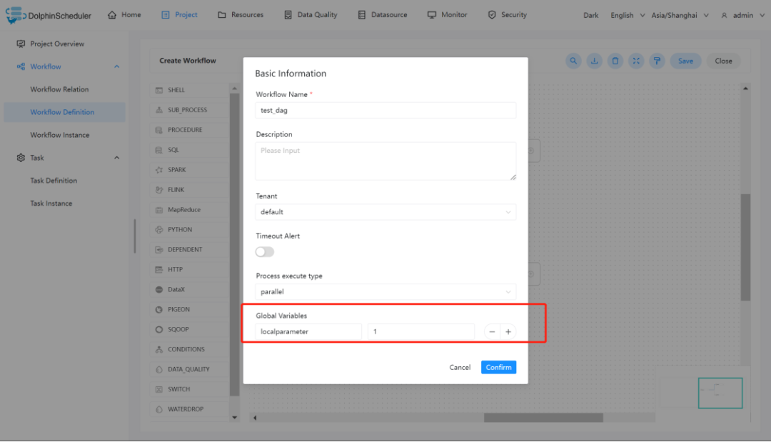•保存工作流定义: 点击”保存“按钮,弹出"设置DAG图名称"弹框,如下图所示,输入工作流定义名称,工作流定义描述,设置全局参数(选填),点击"添加"按钮,工作流定义创建成功。