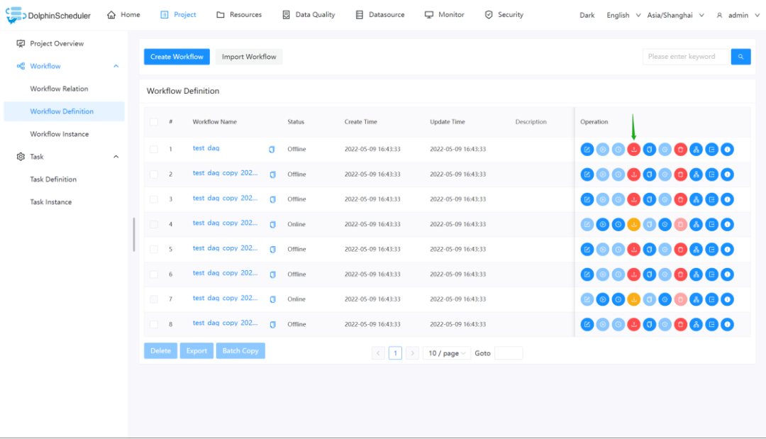 •点击项目管理->工作流->工作流定义,进入工作流定义页面,如下图所示,点击"上线"按钮