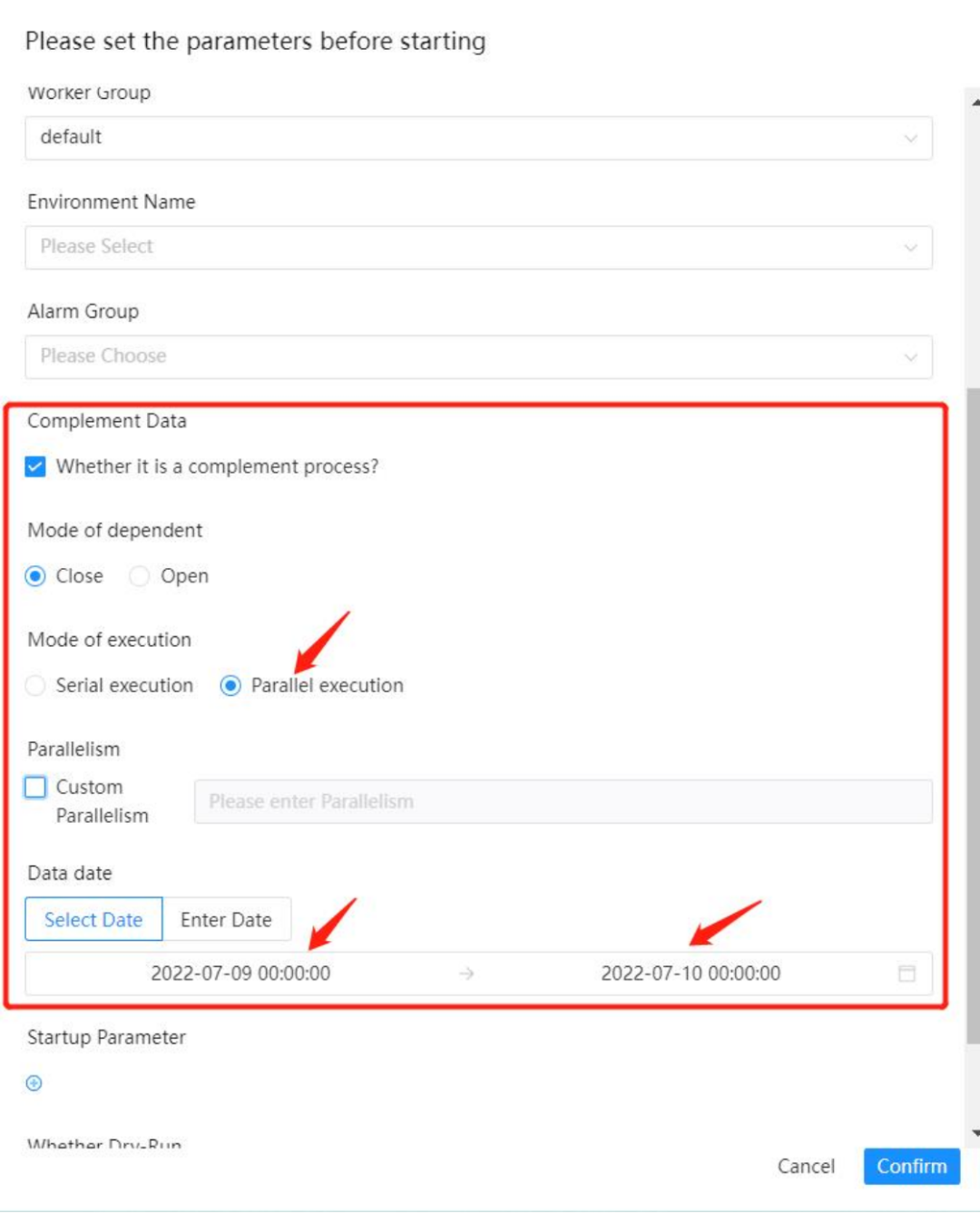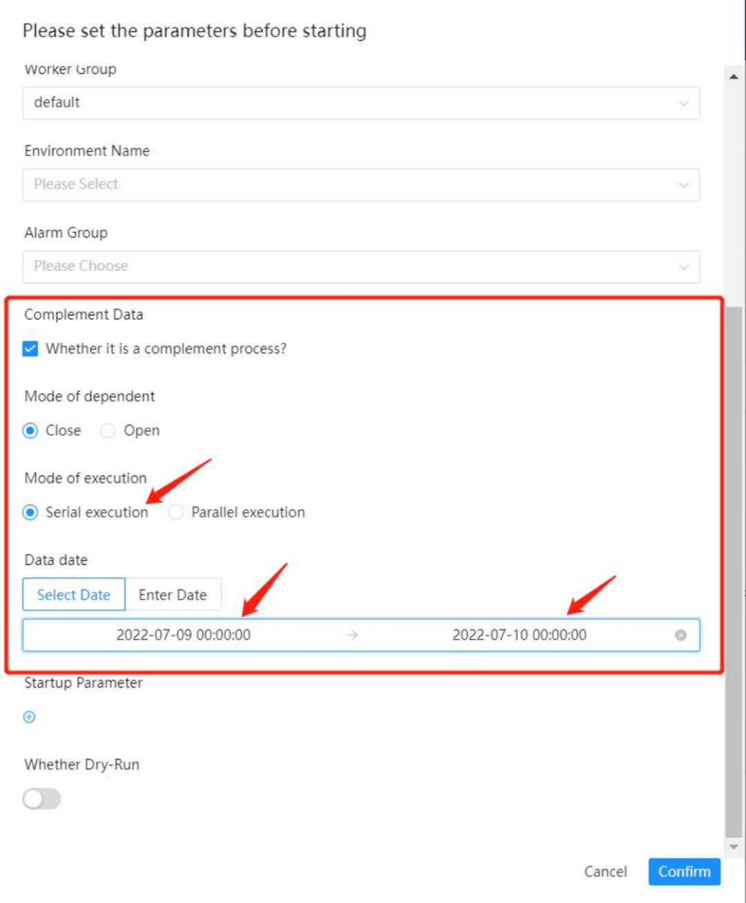 •补数:指运行指定日期范围内的工作流定义,根据补数策略生成对应的工作流实例,补数策略包括串行补数、并行补数 2 种模式。