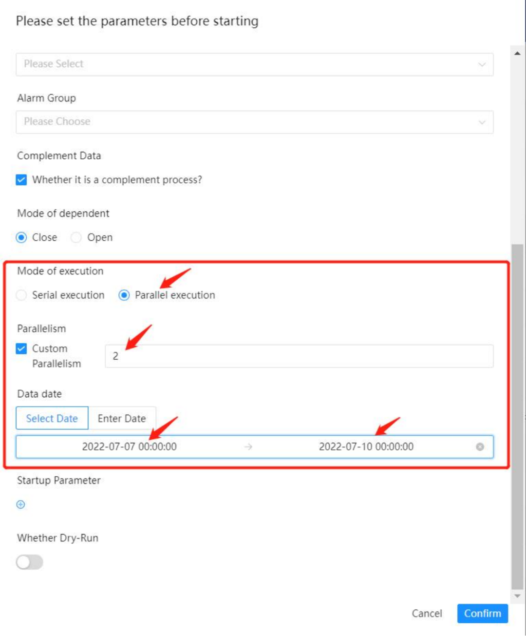 –依赖模式:是否触发下游依赖节点依赖到当前工作流的工作流实例的补数(要求当前补数的工作流实例的定时状态为已上线,只会触发下游直接依赖到当前工作流的补数)。