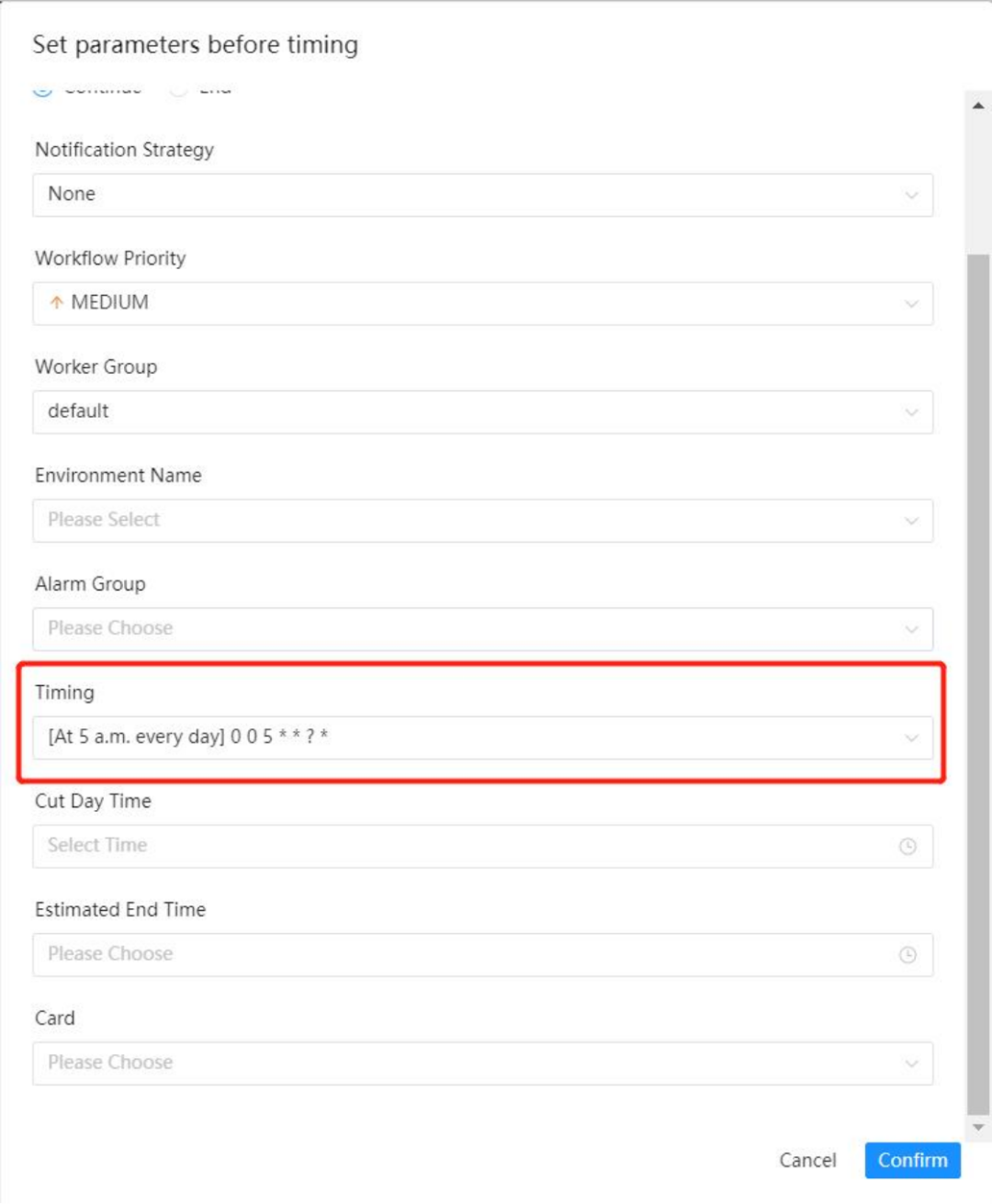 •选择起止时间。在起止时间范围内,定时运行工作流;不在起止时间范围内,不再产生定时工作流实例。