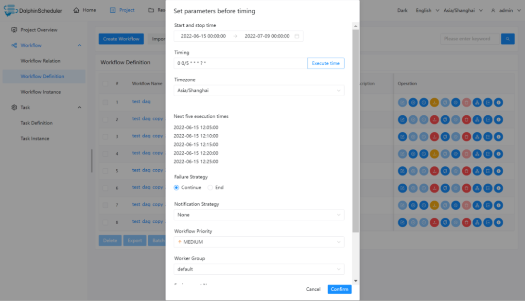•创建定时:点击项目管理->工作流->工作流定义,进入工作流定义页面,上线工作流,点击"定时"按钮