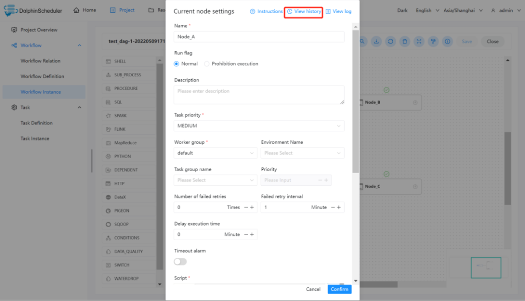 •双击任务节点,如下图所示,点击"查看历史",跳转到任务实例页面,并展示该工作流实例运行的任务实例列表