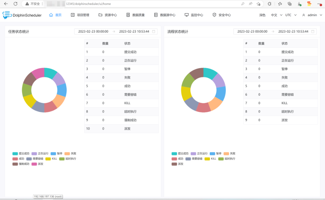 浏览器访问地址 http://192.168.197.136:12345/dolphinscheduler/ui 即可登录系统UI。默认的用户名和密码是 admin/dolphinscheduler123
