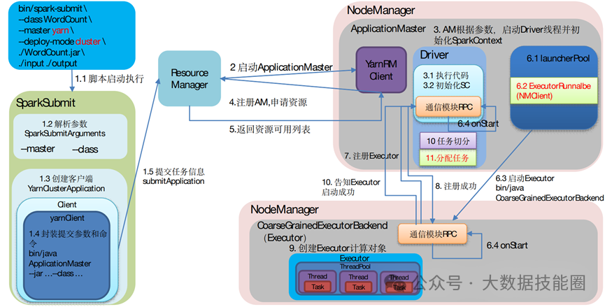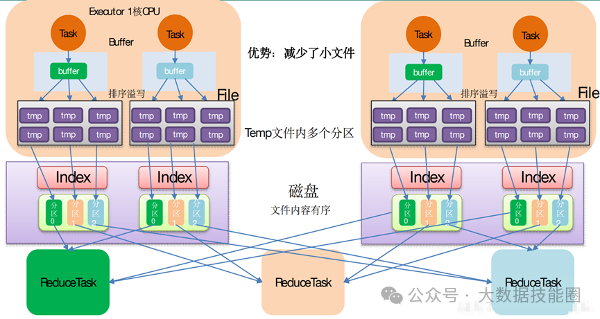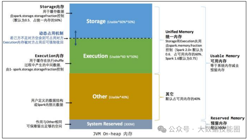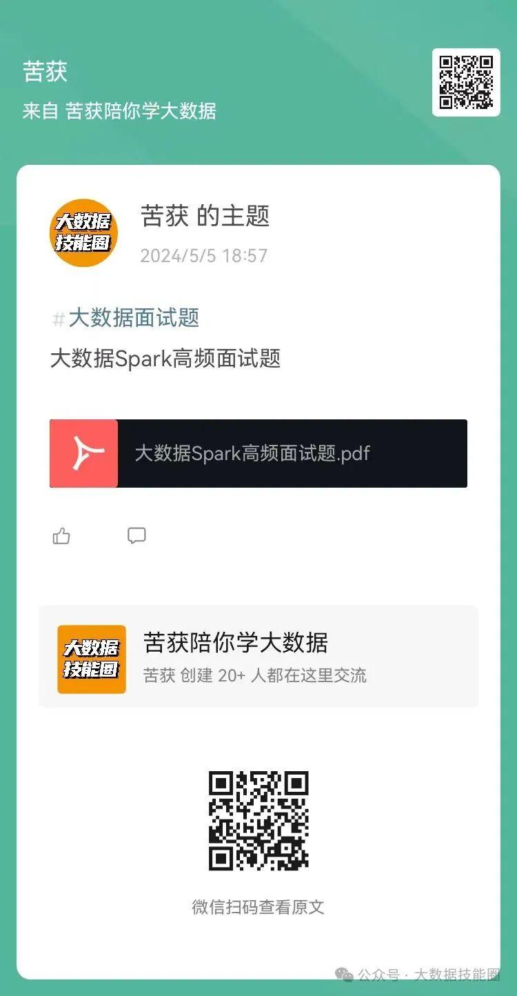 (2)Standalone:是 Spark 自身的一个调度系统。对集群性能要求非常高时用。国内很少使用。(3)Yarn:采用 Hadoop 的资源调度器。国内大量使用。Yarn-client 模式:Driver 运行在 Client 上(不在 AM 里)Yarn-cluster 模式:Driver 在 AM 上(5)K8S:趋势,但是目前不成熟,需要的配置信息太多。(2)7077 内部通讯端口。类比 Hadoop 的 8020/9000(3)8080 查看任务执行情况端口。类比 Hadoop 的 8088(4)18080 历史服务器。类比 Hadoop 的 19888注意:由于 Spark 只负责计算,所有并没有 Hadoop 中存储数据的端口 9870/50070主要表现为存储弹性、计算弹性、任务(Task、Stage)弹性、数据位置弹性,具体如 下(4)Stage 如果失败会自动进行特定次数的重试,而且只会只计算失败的分片(5)Checkpoint【每次对 RDD 操作都会产生新的 RDD,如果链条比较长,计算比较笨重,就把数据放在硬盘中】和 persist 【内存或磁盘中对数据进行复用】(检查点、持久化)(6)数据调度弹性:DAG Task 和资源管理无关(3)mapPartitionsWithIndex(2)mapPartitions:每次处理一个分区数据8 Repartition 和 Coalesce 区别两者都是用来改变 RDD 的 partition 数量的,repartition 底层调用的就是 coalesce 方法:coalesce(numPartitions, shuffle = true)repartition 一定会发生 Shuffle,coalesce 根据传入的参数来判断是否发生 Shuffle。一般情况下增大 rdd 的 partition 数量使用 repartition,减少 partition9 reduceByKey 与 groupByKey 的区别在不影响业务逻辑的前提下,优先采用 reduceByKey(1)Application:初始化一个 SparkContext 即生成一个 Application(2)Job:一个 Action 算子就会生成一个 Job(3)Stage:Stage 等于宽依赖的个数加 1(4)Task:一个 Stage 阶段中,最后一个 RDD 的分区个数就是 Task 的个数。12 SparkSQL 中 RDD、DataFrame、DataSet 三者的转换及区别DataFrame 和 DataSet 的区别:前者是 row 类型RDD 和 DataFrame 及 DataSet 的区别:前者没有字段和表信息13 Hive on Spark 和 Spark on Hive 区别(1)SortShuffle:减少了小文件。中间落盘应该是本地磁盘生成的文件数在溢写磁盘前,先根据 key 进行排序,排序过后的数据,会分批写入到磁盘文件中。默 认批次为 10000 条,数据会以每批一万条写入到磁盘文件。写入磁盘文件通过缓冲区溢写的 方式,每次溢写都会产生一个磁盘文件,也就是说一个 Task 过程会产生多个临时文件。最 后在每个 Task 中,将所有的临时文件合并,这就是 merge 过程,此过程将所有临时文件读取出来,一次写入到最终文件。(4)bypassShuffle:减少了小文件,不排序,效率高。在不需要排序的场景使用。(1)MR 在 Map 阶段会在溢写阶段将中间结果频繁的写入磁盘,在 Reduce 阶段再从 磁盘拉取数据。频繁的磁盘 IO 消耗大量时间(2)Spark 不需要将计算的中间结果写入磁盘。这得益于 Spark 的 RDD,在各个 RDD的分区中,各自处理自己的中间结果即可。在迭代计算时,这一优势更为明显。2)Spark DAG 任务划分减少了不必要的 Shuffle(1)对 MR 来说,每一个 Job 的结果都会落地到磁盘。后续依赖于次 Job 结果的 Job, 会从磁盘中读取数据再进行计算(2)对于 Spark 来说,每一个 Job 的结果都可以保存到内存中,供后续 Job 使用。配 合 Spark 的缓存机制,大大的减少了不必要的 Shuffle(1)MR 任务以进程的方式运行在 Yarn 集群中。N 个 MapTask 就要申请 N 个进程(2)Spark 的任务是以线程的方式运行在进程中。N 个 MapTask 就要申请 N 个线程。17 Spark Shuffle 和 Hadoop Shuffle 区别(1)Hadoop 不用等所有的 MapTask 都结束后开启 ReduceTask;Spark 必须等到父 Stage 都完成,才能去 Fetch 数(2)Hadoop 的 Shuffle 是必须排序的,那么不管是 Map 的输出,还是 Reduce 的输出, 都是分区内有序的,而 Sparkk 不要求这一点executor-cores —— 每个 executor 使用的内核数,默认为 1,官方建议 2-5 个,我们企业是 4 个num-executors —— 启动 executors 的数量,默认为 2