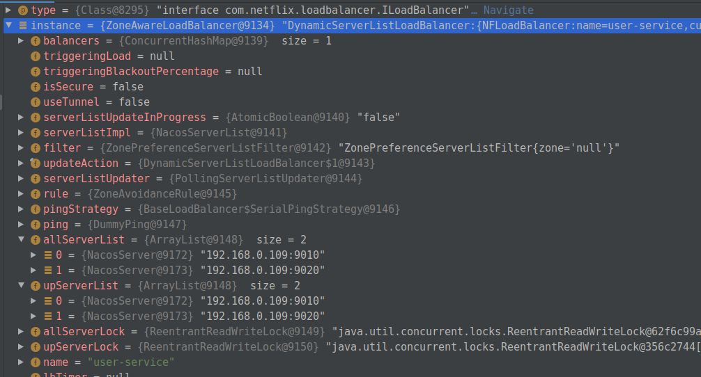 负载均衡的部分源码。因为在学习源码过程中我启动了几次服务,可能有时候服务的端口号没有对应上,比如前面服务的端口号可能是9010,后面就成了9020,这点希望小伙伴谅解下。最后这一块还有一点我没有提及到,那就是获取服务列表信息,我们使用Nacos
