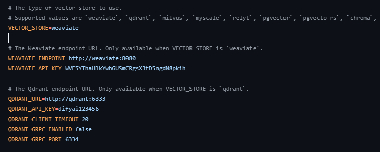 以Dify为例,其在本地部署时,默认使用的是「build in」模式的Weaviate,用户需要手动配置相关参数,且可配置参数也相对较少。