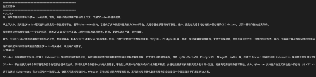 在进行上述demo的搭建后,我们可以用一个简单的问题来实验下效果,当我们输入「QFusion平台有什么特性」后,系统在思考后返回了如下内容: